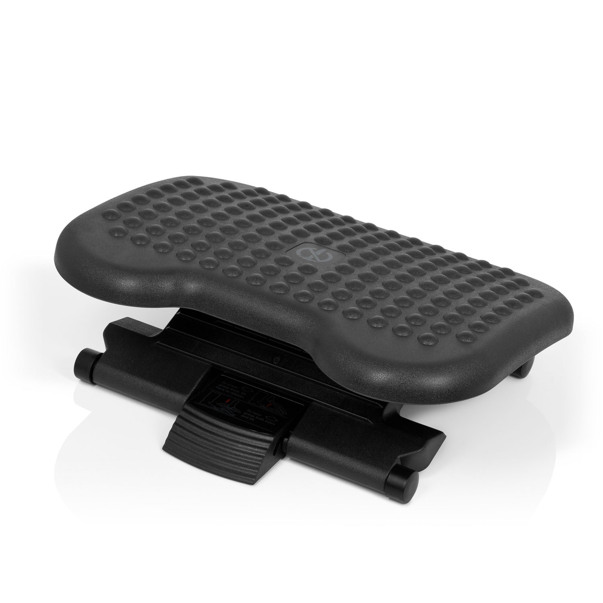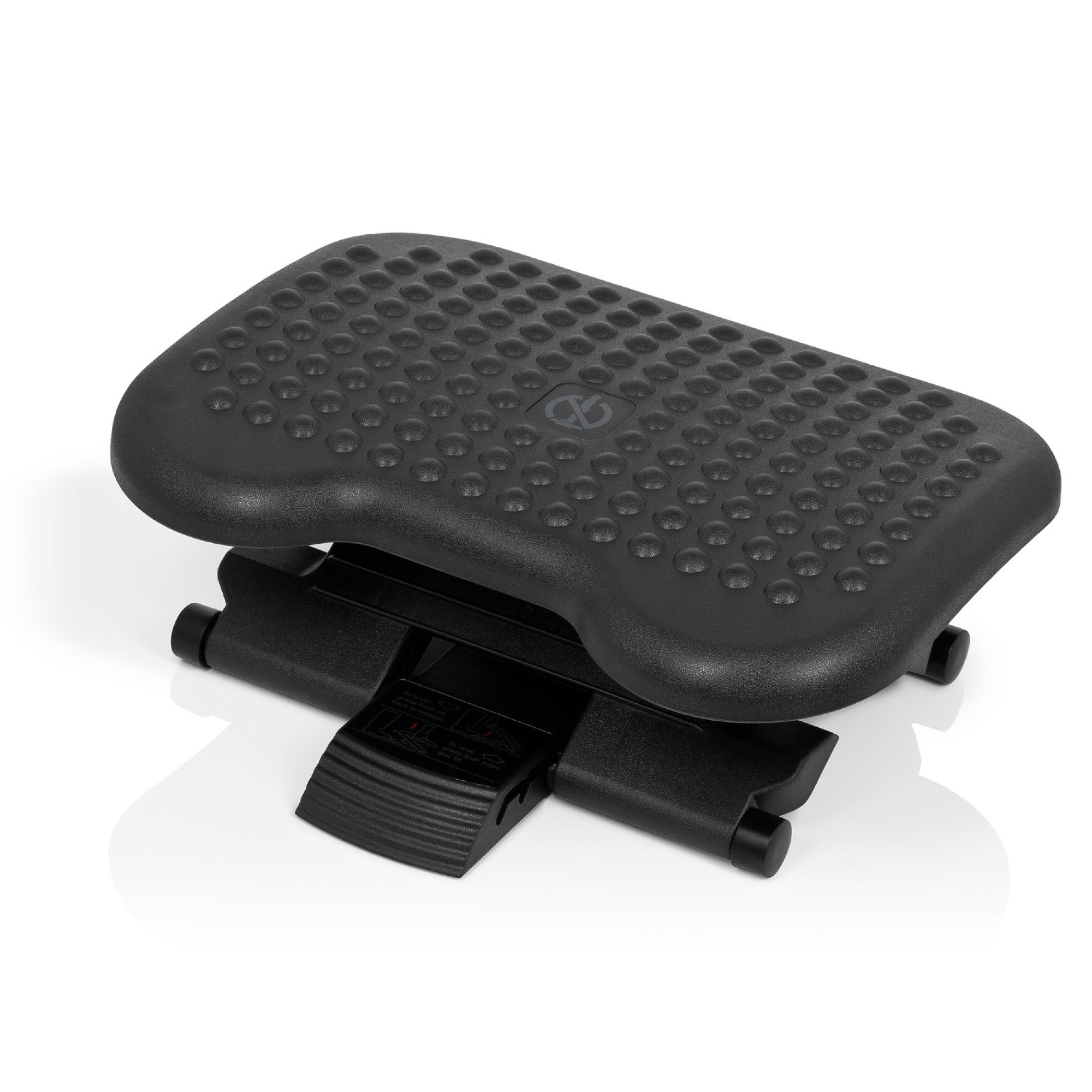 Höhenverstellbare und neigbare Fußstütze mit Noppenbesatz zur Fußmassage.